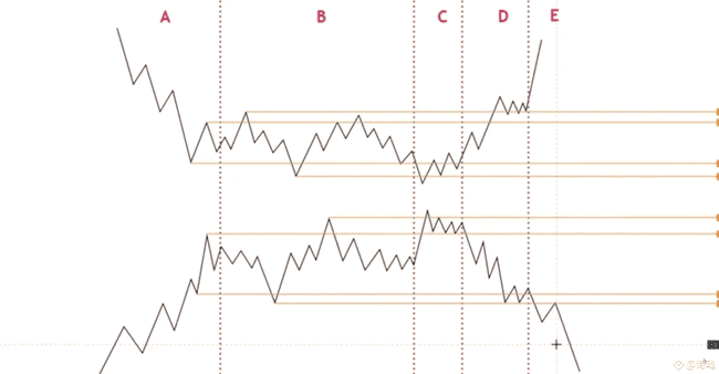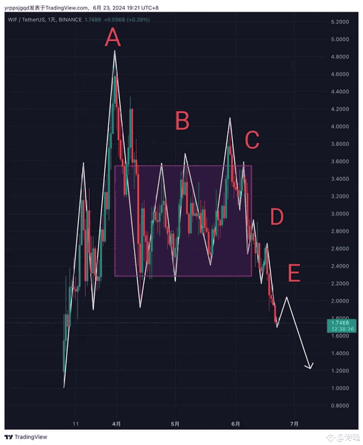 (1)首先如图一,是一个wif日线级别的图表,图中表明了ABCDE五个阶段,也代表了wif背后五个阶段的供需关系与威科夫派发结构(2)先看图表中的A段,A段是从wif日线上线币安开始,一直走一个上升趋势的阶段,这一阶段形成了整个wif走势的最高点,这一阶段我们叫做wif的首次供应引起市场关注,再到形成fomo的抢购热潮,其中供应量远远小于需求量,所以形成整个走势中的最高点。