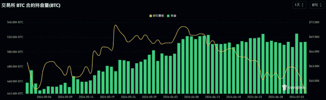 Coinglass 的数据显示,以 BTC 计价的未平仓合约在四周内一直保持在 50 万 BTC 之上。同时,交易所的永续合约资金费率持续为正值,这显示了市场的看涨押注倾向。