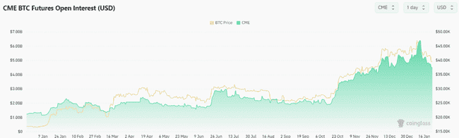 值得注意的是,比特币价格下行的同时,芝商所(CME)的比特币(BTC)期货未平仓合约(OI)突然大幅减少,这表明机构投资者对比特币杠杆曝险的兴致有所下降。根据 CoinGlass 的数据,CME 的未平仓合约从 1 月 12 日接近历史最高点的 64 亿美元下降到约 45 亿美元。