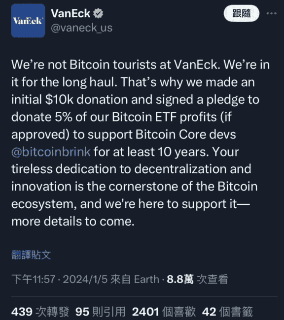 关于比特币 ETF 收费机制的另一个有趣的事情是,资产管理公司 VanEck 此前曾公开发文承诺长期投资比特币生态系统,并表示一旦其比特币 ETF 获得批准,将把潜在利润的 5% 分配给比特币生态开发者 Brink 至少十年的时间。到目前为止,其他发行商皆未做出类似的承诺。