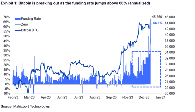 Matrixport 指出,这就是期货市场挤压现货市场的方式,其「可能将使比特币在 2024 年 1 月超过我们的 5 万美元目标水平」,该公司甚至预期本周末就有可能超过 5 万美元。