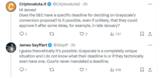 值得一提的是,James Seyffart 在回复社群成员的疑问时还表示,法院并未规定灰度的比特币现货 ETF 转换申请的截止日期,因此从理论上讲,灰度的申请有可能不会在一月中的截止日前获得通过: