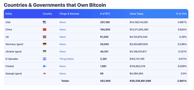 根据 bitcointreasuries 的统计数据显示,目前持有最多比特币的国家为美国,总计持有超过 20 万颗,总价值超过 140 亿美金,而排名第二的中国持有的比特币价值也同样超过百亿美金。