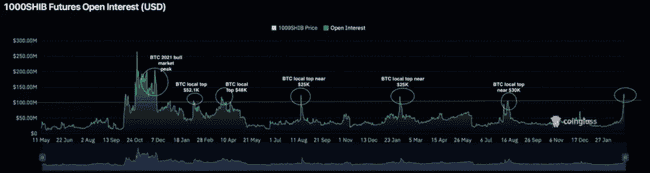 根据 CoinGlass 的数据,过去每当 SHIB 期货未平仓合约超过 1 亿美元时,通常代表著比特币价格达到一个阶段性高点。