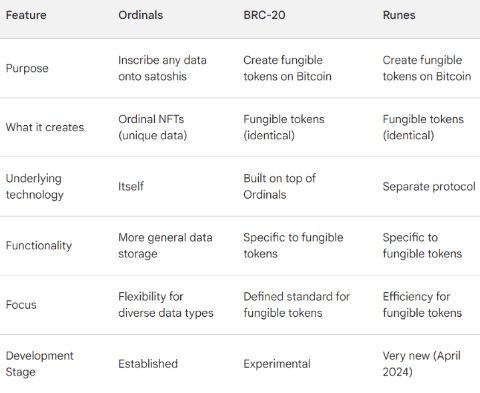 序数是由 @rodarmor 于 2023 年 1 月推出的,它增加了可以储存在区块链上的资料量,从而推广了铭文。这激发了一系列使用该系统的创新,例如 BRC-20 和符文,它们之间的区别下表。