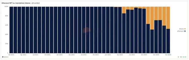 随著比特币减半和符文协议的推出,序数的交易量呈指数级增长。值得注意的是,过去一个月内,比特币的交易量几乎与以太坊持平,主要市场为 OKX 和 MagicEden。