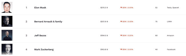 根据富比士实时亿万富翁榜单中,马斯克以 2103 亿美元资产高居「全球首富」的头衔,随后则是 LVMN 创办人Bernard Arnault、Amazon 创办人贝佐斯(Jeff Bezos)和 Meta 创办人祖克柏(Mark Zuckerberg),分别以 2019 亿美元、1945 亿美元和 1638 亿美元,位列 2~4 名。