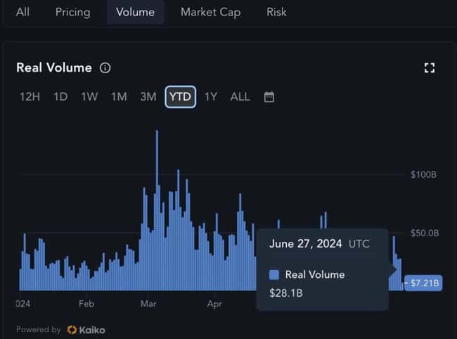 另根据 Messari 的数据,USDT 的交易量自 3 月初的 1,375 亿美元高点后,近几个月都是持续下滑,昨日交易量只有 280 亿美元,而总供应量目前则维持在 1127 亿美元左右。