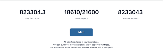 铸造 MOVE 的机制设计得相当独特。具体来说,每分钟每个地址可以铸造一张铭文。因此,用户只需每分钟进行一次铸造操作(mint)即可。在每次 mint 过程中,用户需要将 0.1 SUI 质押到该铭文中。