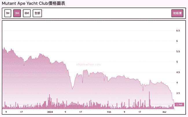根据 NFT Price Floor 的数据显示,变异猿(MAYC)的地板价已跌破 3 ETH,目前为 2.949 ETH,低于该 NFT 最初透过荷式拍卖公开发行的初始价格(3 ETH)。