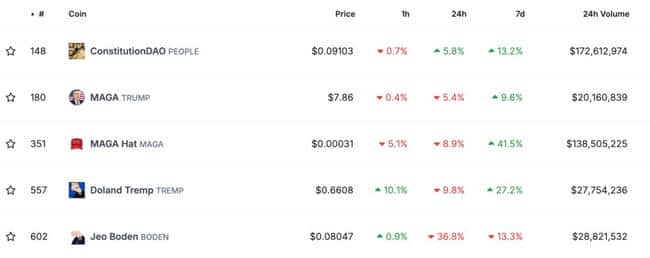 根据 Coingecko 数据显示,在代币分类排行中,政治迷因币近 24 小时平均跌幅达 7%。而分别代表川普与拜登的迷因币: