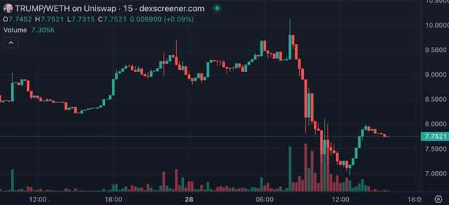 根据 Dexscreener 显示,川普同名代币 TRUMP,价格在今日辩论正式开始前(九点)最高触及 10.12 美元高点,上涨幅度高达 32.28% ,但辩论会正式开始后便遭遇重挫,截稿前略有回弹现报 7.75 美元。