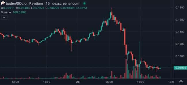拜登概念代币 BODEN 走势与 TRUMP 类似,也在今日早晨最高来到 0.1767 美元高点(涨幅一度达 63.9%)后,随即遭遇重挫,现报 0.08 美元。