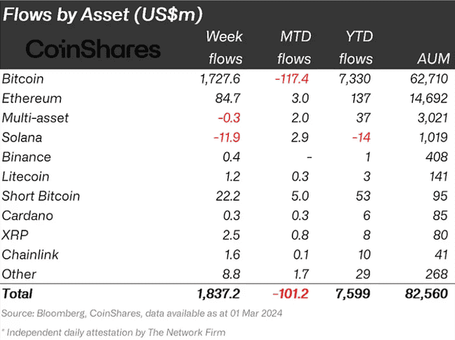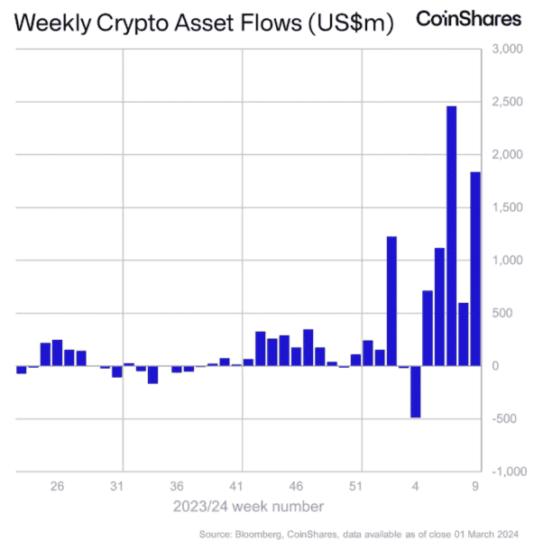 根据加密资产管理公司 CoinShares 在周一(4日)发布的数据,上周数位资产投资产品达到有纪录以来第二高的单周资金净流入,总额达 18.4 亿美元,94% 的资金流入了比特币投资产品,总额达 17.3 亿美元。