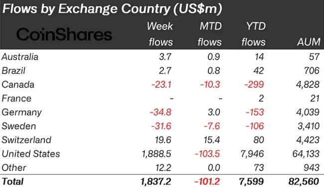 CoinSharesCoinSharesCoinShares报告:数位资产ETP上周净流入18.4亿美元,交易量创新高破300亿美元报告:数位资产ETP上周净流入18.4亿美元,交易量创新高破300亿