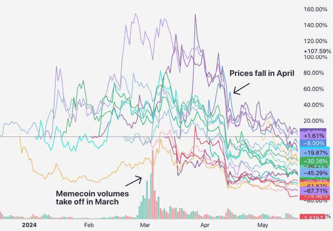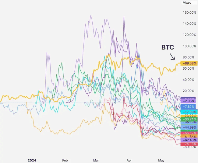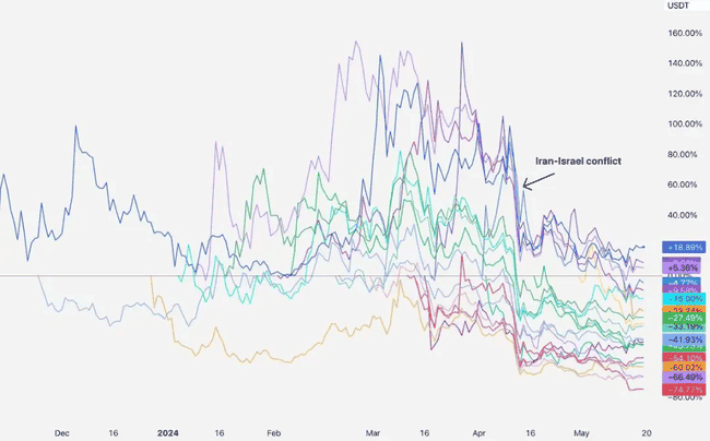 在前几个月里,这些代币大多在它们上市后交投基本持平,直到四月中旬。突然间,伊朗和以色列开始威胁爆发第三次世界大战,市场大幅下挫。比特币反弹了,但这些代币没有。