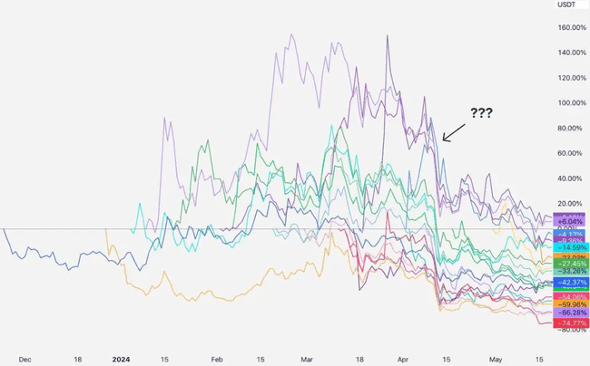 因此,从上市到 4 月初,这些代币实际上表现良好,有些价格高于上市价,有些价格低于上市价,但大多数都集中在 0 附近。在那之前,似乎没有任何 VC 或 KOL 开始抛售。