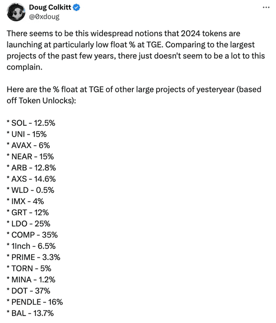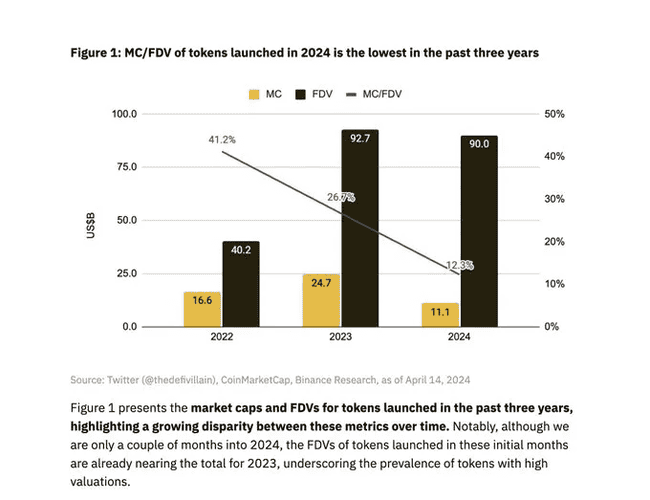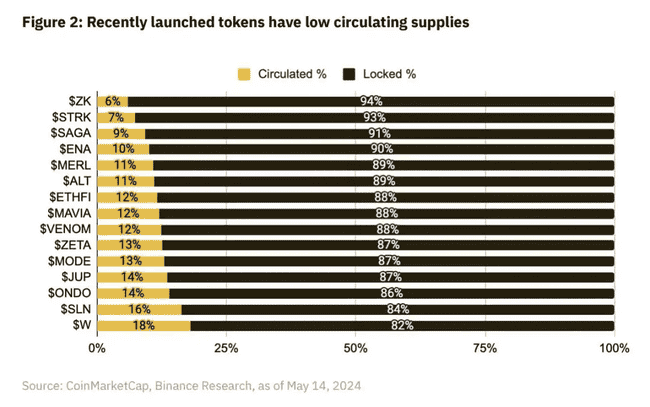 同一份币安研究部的文章也有一张图表,也在网路上广为流传,在 2022 年推出的代币在上市时的平均流通供应量为 41%。