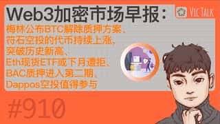 Web3加密市场早报:梅林公布BTC解除质押方案,符石代币创新高,Eth现货ETF或遭拒,BAC质押二期启动,Dappos空投受热捧,Vic TALK第910期发布