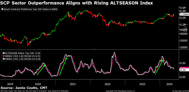 在此背景下,前彭博分析师 Jamie Coutts 今日在 X 平台发推表示,他利用智慧合约平台指数(Smart Contract Platforms,SCP)、山寨季指数(Altseason index)、美国总统大选和流动性周期等因素,作为判断基准,判断山寨季讯号预计会在未来几周内出现。