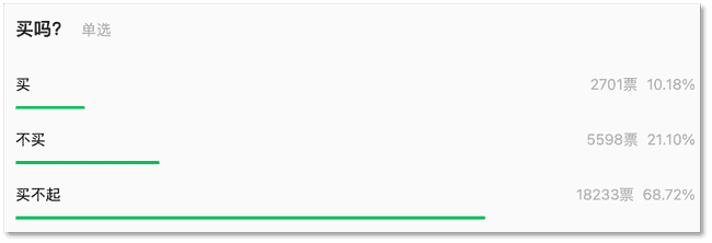 在一项关于是否会购买新版 iPad 的投票中,有高达 68.72% 的使用者选择的 「买不起」 这一选项,共 18233 票。