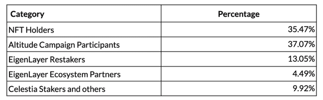 以太方扩容方案 AltLayer 已于 1 月 25 日开放领取 3 亿颗代币空投,撰写本文时价值约 1 亿美金。包含 OG Badge 与 Oh Ottie! NFT 持有人、Altitude 活动参与者、EigenLayer 再质押者、EigenLayer 生态系统合作伙伴和 Celestia 质押者都有机会获得代币空投。但需要留意的是,由于技术问题,Celestia 质押者的代币空投还需要一段时间才能提领。