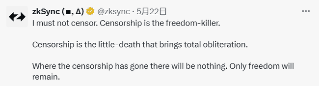 5 月 22 日,计划本周 TGE 的 zkSync 发文表示,「我绝不能审查。审查制度是自由的杀手。」