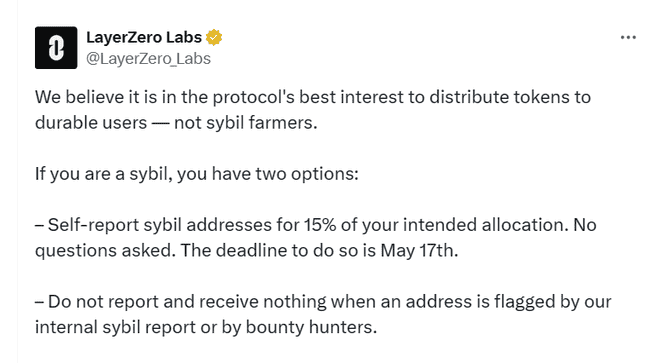 从 5 月 4 日起,认为自己的地址有女巫嫌疑的使用者有 14 天的时间向 LayerZero 自行报告,经过 LayerZero 确认后可以保留 15% 的空投额度,但未自行报告的地址一经识别空投份额将被清零。
