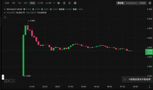 另一方面,台湾时间 6 月 20 日 20:00 点,LayerZero 原生代币 ZRO 已陆续在 OKX、Bitget、币安等交易所登陆,开盘后 ZRO 最高一度来到 4.89 美元。