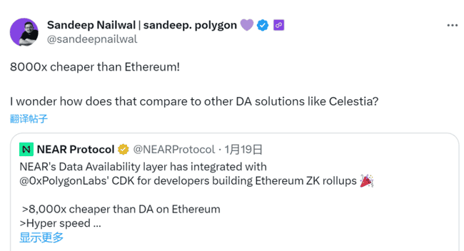 因此目前 Aleo、Dymension、ZKFair 等新专案就相继投身 Celestia 等新的 DA 解决方案来降低成本,甚至 Polygon 也选择转向 NEAR,并直言「比以太坊便宜 8,000 倍」。