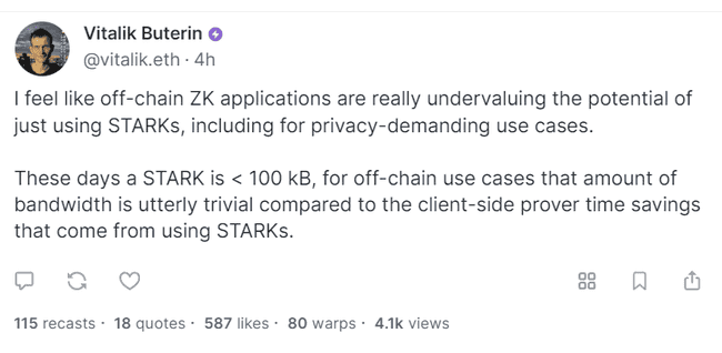 以太坊创办人 Vitalik Buterin 昨(17)日稍晚在 Web3 社交平台 Warpcast 上发文感慨,表示链下 ZK(零知识证明)应用程式低估了使用 STARK 的潜力: