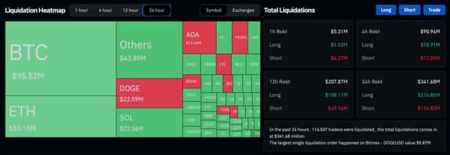 虽然没有昨日爆仓状况严重,不过据 Coinglass 数据显示,过去 24 小时,全网爆仓金额仍超过 3.4 亿美元、有 11.4 万人遭清算,市场波动仍剧烈。