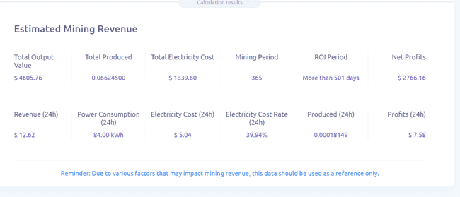 根据 F2POOL 计算机试算,按 ANTMINER S21 Pro 参数输入,比特币以 69526.13 美元为计算,减半后收益仍可维持在 14.5 美元/天左右,,若每台售价在 6,400 美元左右,在电力费用为 0.06 美元的条件下,回本期约为 501天。