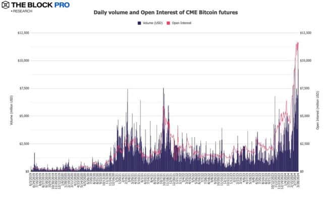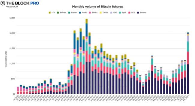 8. 加密期货方面,3 月比特币期货未平仓量上涨了 33.2%,以太坊期货未平仓量上涨 18.6%;期货交易额方面,比特币期货 3 月交易额成长达 80.8%,升至 2.02 兆美元。