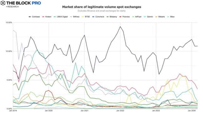 7.3 月各大加密货币交易所的现货市占率排名如下:币安为 78.5%(较 1 月及 2 月均上升)、Coinbase 为 10.9%、Kraken 为 3.4%、LMAX Digital 为 1.3% 。