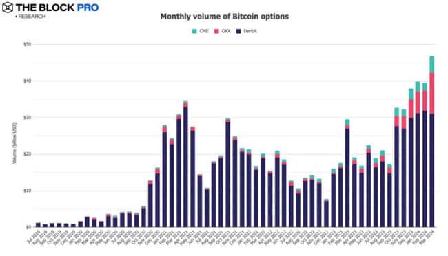 11. 加密货币选择权方面,3 月比特币选择权未平仓量出现下跌,降幅为 1.9%,以太币持股量也在走低,跌幅 6.6%。另外,在比特币和以太坊选择权交易额方面,两者均在 3 月 29 日触及历史高点,其中比特币选择权交易额达到 467.5 亿美元新高,涨幅 18.5%;以太坊选择权交易金额达 209.9 亿美元新高,涨幅 23.6%。