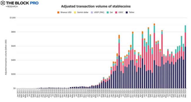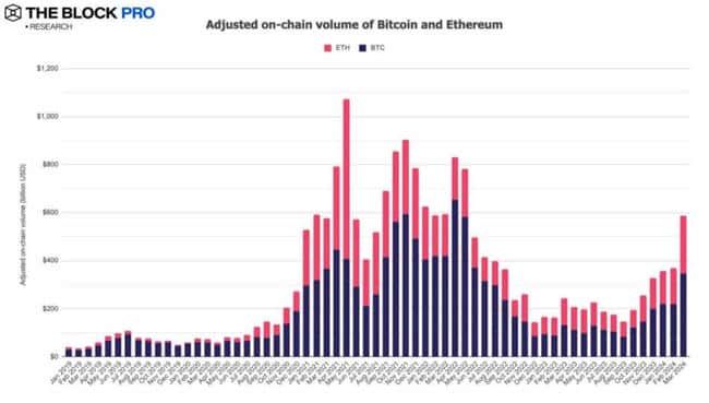 1、3 月,比特币和以太坊调整后链上总交易额整体上涨了 59.3%,达到 5870 亿美元,其中比特币调整后链上交易额上涨了 59.5%,以太坊链上交易额涨幅则达到 59.1%。