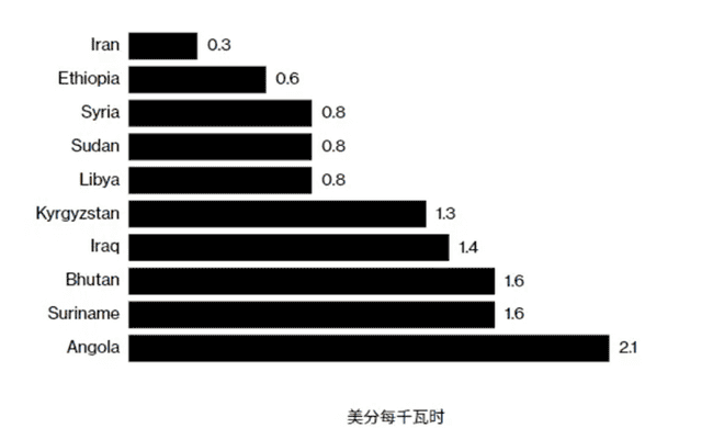 比特币矿机会使用大量电力,电力占矿工运营成本的比例高达 80%,因此获得廉价电力是挖矿的一项关键的竞争优势。2023 年比特币挖矿消耗了 121 兆瓦时的电力,对丰富电力的依赖是其主要弱点,因为对电力的依赖可能会挤占工厂和家庭电力使用,从而使挖矿企业面临政治抵制。衣索比亚电力价格低廉,如图(来源:Statista 研究部)所示。衣索比亚国家电力公司表示,已与 21 家比特币矿工达成供电协议,其中 19 家都来自中国。