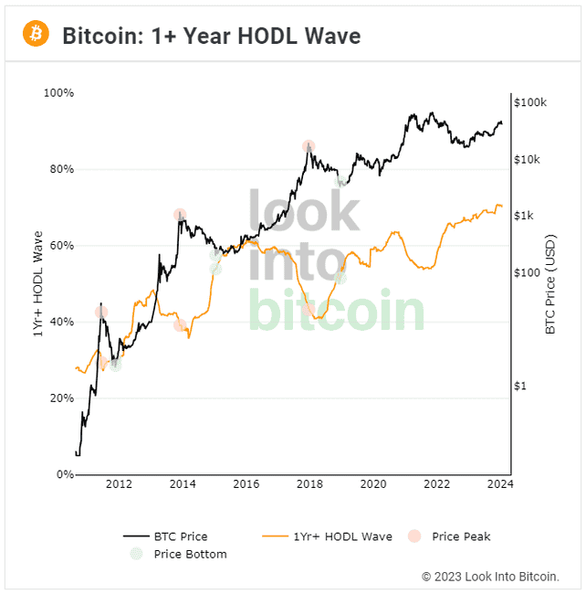 供应量是固定的,但在任何特定时间,其中一部分可能掌握在弱手手中,也可能掌握在强手手中。在牛市期间,许多新投资者兴奋地买入,一些长期持有者则削减持仓并出售给这些新买家。在熊市期间,许多最近的买家亏本出售,而更坚定的人则很少出售。供应从要想赚快钱的弱手转向不会轻易放弃的强手。下图表显示了一年多来没有在链上转移的比特币的百分比,以及比特币的价格: