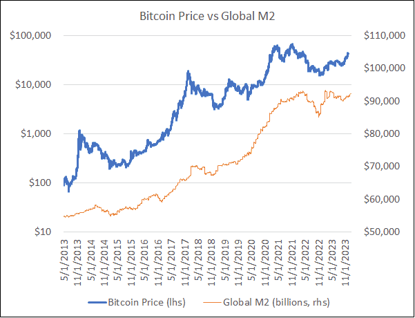 Look Into Bitcoin 有一个巨集观资料套件,作为其中的一部分,它们显示了比特币价格与全球广义货币变化率的关系,我用它制作了一个图表: