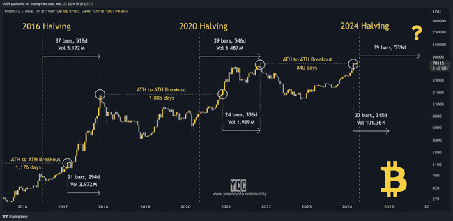 看看下面的图表。请注意 ATH 到 ATH 突破之间的时间是如何缩短的。 1,176 天,然后是 1,085 天,最近是 840 天。后者之所以最短,是因为 BTC 在 ETF 获批后不久、减半前就创下了新纪录!