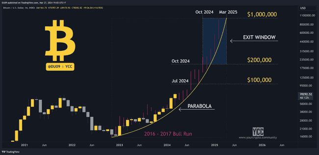 比特币总是在价格突破旧的历史最高价后的 10 到 11 个月内达到顶峰。因此,我倾向于将我们的起点设定为 2024 年 3 月突破 6.9 万美元,并从那里开始计算 10 个月。如果事情保持不变,这将导致比特币在 2024 年 12 月到 2025 年 1 月之间达到顶峰。