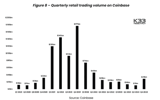 另一种知道你是否在正确的时候获利止盈的方法是 Coinbase 有没有在交易量上创下新纪录。如果季度交易量超过 1500 亿美元,你就是在正确的时候止盈。下图资料显示,目前的交易量正在逐步上涨。